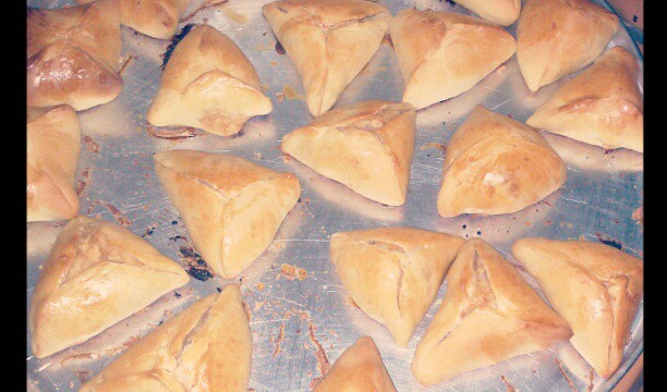 Abra a bolinha de massa com a palma da mão, coloque uma colheirinha de recheio e feche 3 pontas da massa para fazer um triângulo.