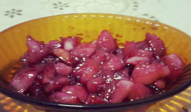 Corte os jambos em pedaços pequenos, sem descascar, e coloque em um recipiente junto com uma xícara de açúcar e deixe reservado por aproximadamente 15 minutos.