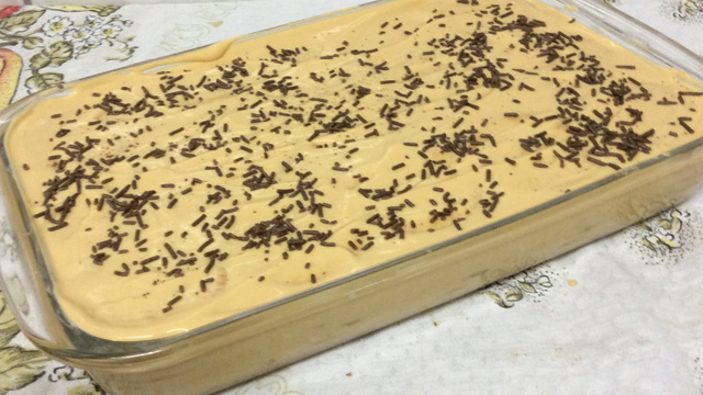 Uma camada de creme e outra de bolacha e mais uma de creme e outra de bolacha.