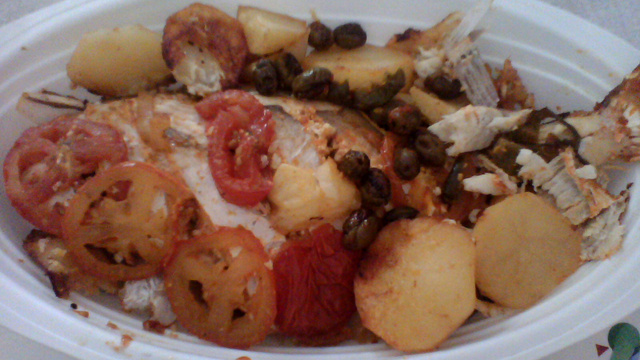 Corte o pimentão, o tomate e as batatas, colocando-as na assadeira com o azeite de fundo