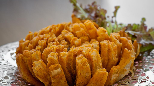 Passe a cebola na farinha de trigo na batida de ovos, empane na farinha e rosca, e frite em óleo quente.