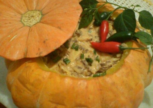 Despeje o recheio na moranga e salpique com cheiro verde. Deve ser servido imediatamente.