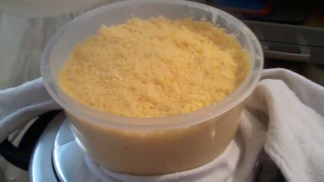 Coloque água na panela de pressão (quase chegando na metade da panela), feche a panela com a tampa já com o pote com o milho em cima , eu costumo tampar o pote mas deixar um pouquinho aberto, e entre o pote e a tampa (no meio dos dois) eu coloco um pano de prato(pra não correr o risco do pote esquentar muito e derreter, tem pote que é muito frágil).