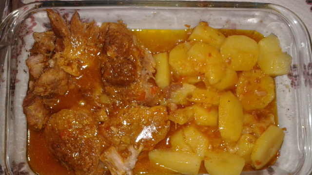 Coloque as batatas cortadas em rodelas e deixe cozinhar por 5 minutos, retire a batata e junte ao pernil acrescentando o caldo.