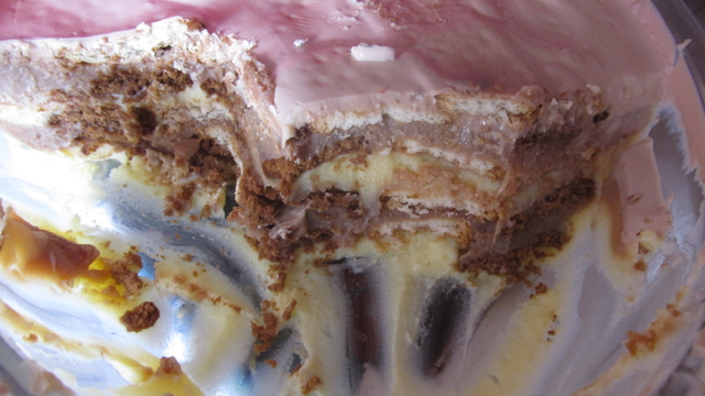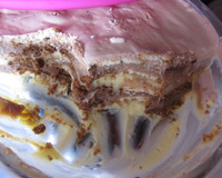 Coloque uma camada de creme branco, molhe os biscoitos com o leite e com o toddy (achocolatado) e coloque em cima do creme intercalando entre um biscoito branco e um biscoito de chocolate, coloque o creme preto e siga a diante, faça uma última camada de biscoito e reserve.
