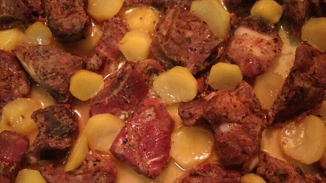 Obs. Não precisa untar, as batatas soltam água e as costelas gordura.