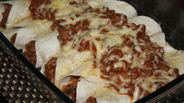 Vá recheando cada panqueca e colocando em um refratário.