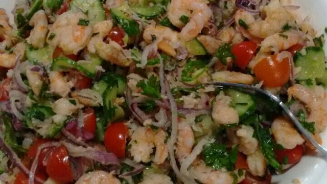 Em seguida, misture o suco de 1 limão, com o camarão, a cebola roxa, o pepino picado, e os demais ingredientes.