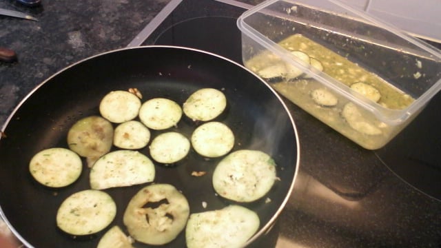 Depois em uma frigideira antiaderente vá grelhando a berinjela e aos poucos jogando a mistura dos temperos na frigideira.