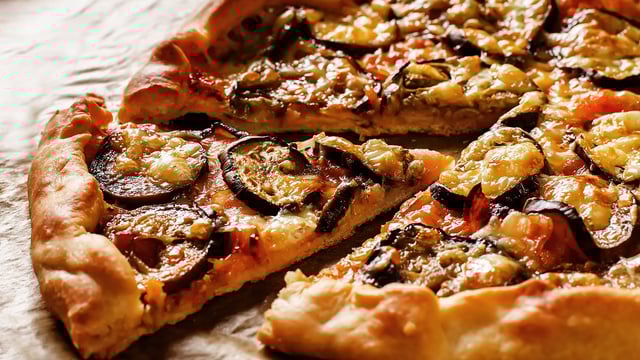 Retirar a pizza do forno, espalhar o molho de tomate, distribuir as fatias de mussarela, espalhar o tomate, palmito e cebola, distribuir as azeitonas e regar com um fio de azeite extra virgem.