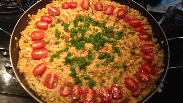 Depois de desligar o fogo, cai bem uma cebola em rodelas e a cebolinha verde bem picadinha em cima do arroz.