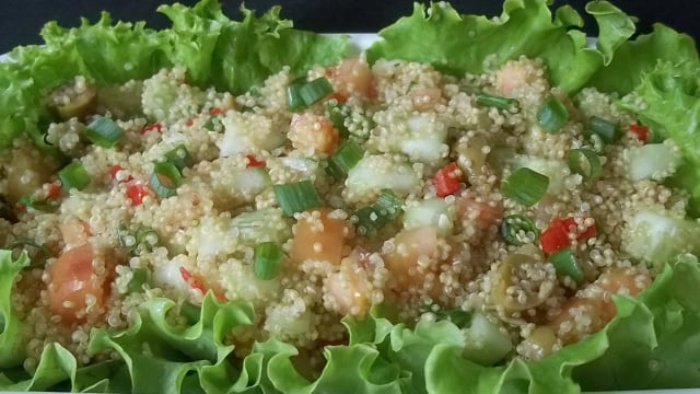 Em uma panela colocar a quinoa para cozinhar em 2 xícaras de água fervente.Deixar por uns 10 minutos.Escorrer em uma peneira.Esperar esfriar.