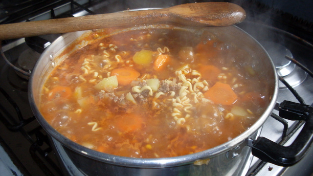 Vá mexendo de vez em quando até cozinhar os legumes e o macarrão.