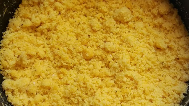 Tampe a panela por alguns minutos, torne abrir e pingue mais um pouquinho de água e mexa bem de modo que fique parecendo uma farofa.