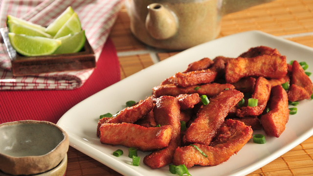 Corte o lombo em pequenas tiras e na espessura de um dedo. Na panela aquecida, frite a carne até estar no ponto e escorra. Em outra panela aquecida coloque sal, glutamato, óleo de gergelim e cebolinha. Misture bem. Acrescente o lombo escorrido e mexa por alguns minutos. Coloque a carne em uma travessa e sirva com pedaços de limão para tirar a acidez do lombo.Pode ser acompanhada por arroz e salada.