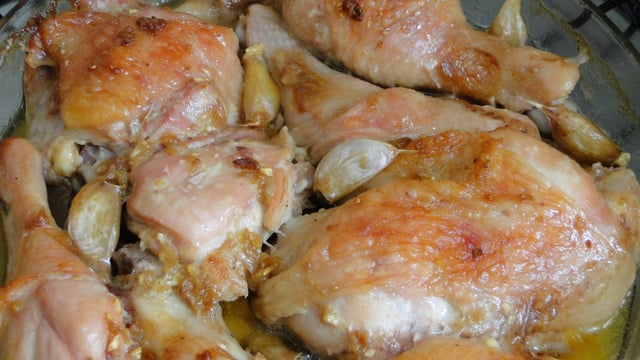 Após amornar, tempere cada pedaço na mistura e coloque no refratário, de preferência com as peles para cima (faça pequenas perfurações nos pedaços para que a mistura penetre, depois de assadas, as perfurações não aparecem).