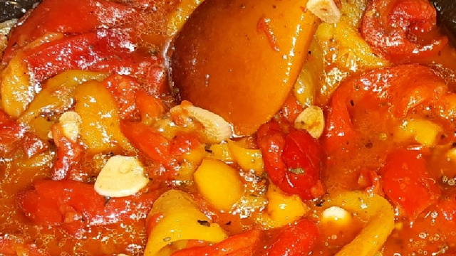 Misturando o restante do azeite com a páprica picante e o vinagre e coloque sobre os pimentões.