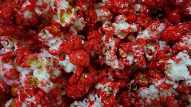 Em uma pipoqueira coloque todos os ingredientes, o milho, o óleo, a água, o açúcar e o corante.