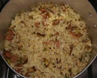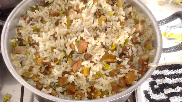Refogue o arroz e acrescente 1 litro de água fervendo.Em seguida coloque o feijão, o cheiro verde e o sal a gosto. Deixe ferver.