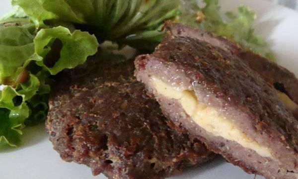 Pegue uma porção de carne e, com a ajuda de um plástico, abra um hambúrguer fino e grande coloque o queijo no meio, abra outra porção e coloque por cima, feche apertando bem dos lados e corte com um cortador redondo de 10cm de diâmetro mais ou menos. Faça isso com toda a massa de carne.