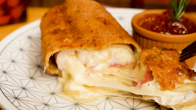 Enrole o bifinho de frango e prenda com palitos de dentes, para que o recheio não saia. Repita com os outros bifes e reserve.