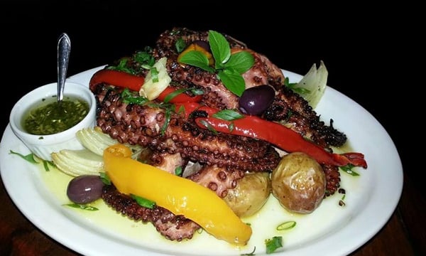 Pegue as batatas e tire todo o excesso de sal. Amasse-as, “dê um leve murro” para que elas estourem as beiradas. Disponha as batatas no prato, coloque o polvo por cima, enfeite com os pimentões e com as cebolas. Acrescente algumas azeitonas pretas e regue com azeite de boa qualidade.