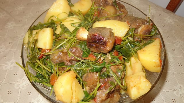 Refogar em uma panela de pressão o alho, cebola e a pimenta. Colocar a carne e todo o caldo da marinada. Deixar a carne refogar até ficar um pouco dourada. Colocar caldo de carne, páprica, os tomates, água até tampar a carne, acertar o sal e a pimenta-do-reino. Tampar a panela de pressão e deixar cozinhando por 20 minutos. Abrir a panela, colocar as batatas e deixar mais 10 minutos na pressão. Checar se a batata amoleceu, colocar o agrião, a salsinha e cebolinha e deixar cozinhando com a panela aberta. Quando o agrião estiver macio, pode desligar e servir.