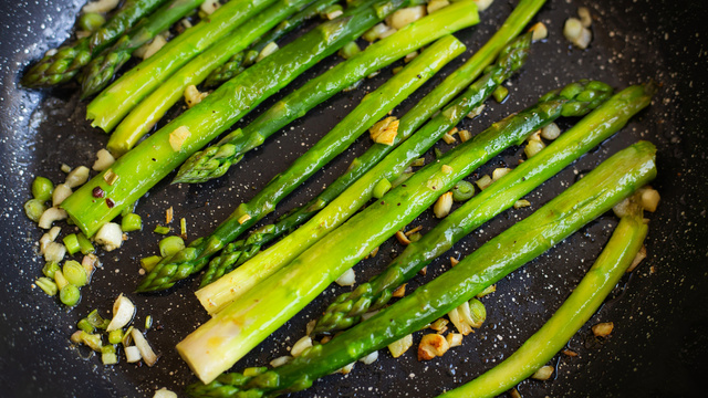 Em uma frigideira, aqueça o azeite e coloque os aspargos e o alho.