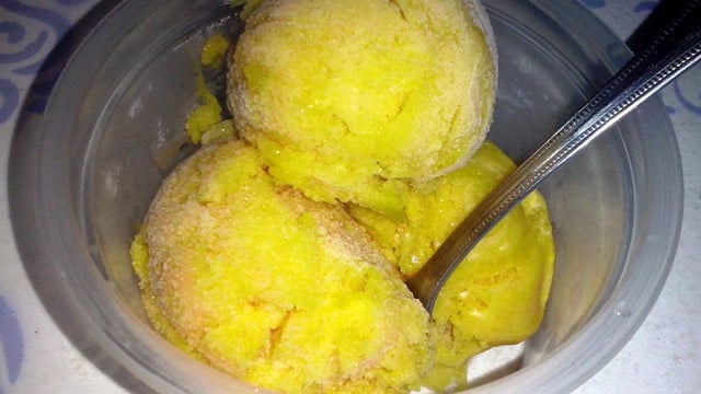 Levar ao congelador e misturar a cada 2 horas com um garfo ou colher por até 3 vezes. Acrescentar os pedaços de fruta quando for misturar, para não ficar no fundo.