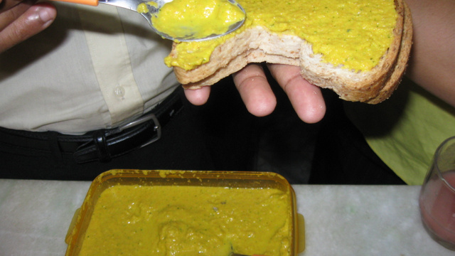 Descasca a cenoura e a cebola, cortar aos pedaços, junta todos os ingredientes no liquidificador e bate, formando uma pasta. Pronto. É só passar no pão.