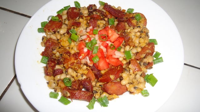 Quando a gordura do bacon estiver reduzida, junte a charque e a calabresa.