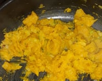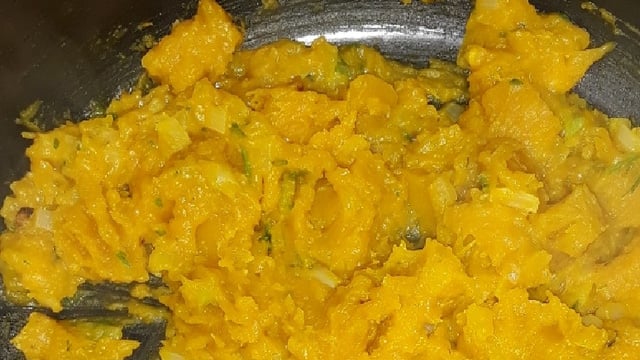 Desligue o fogo, coloque em uma tigela e amasse bem até ficar um purê de moranga temperado.