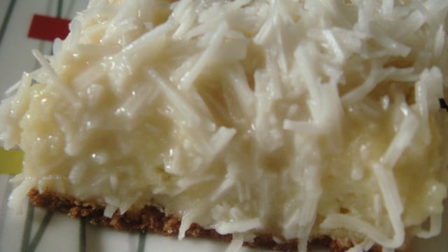Retire o bolo do forno, fure com um garfo e ainda quente na própria forma, cubra-o com o leite condensado e o coco ralado umedecido. Corte em quadrados e sirva.Pode ser embrulhado em papel alumínio.