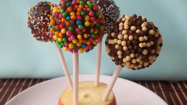 Derreter o restante do chocolate para cobertura e mergulhar as bolinhas, com cuidado para não soltar do palito.Retirar levemente o excesso e colocar os confeitos, esperar secar e fixar em isopor ou como desejar, (existe no comércio utensílios apropriados).