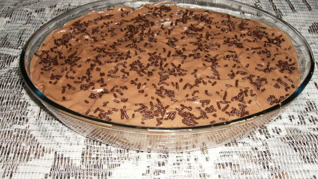 OBS:Os biscoitos não deve, ser molhados e sim colocados ao natural.Se preferir na última camada, pode-se colocar um creme feito com 100g de chocolate em barra meio amargo e uma caixinha de creme de leite.Esquente o creme de leite no microondas por mais ou menos 1 minuto e acrescente o chocolate já ralado.Misture bem e empregue.Por cima polvilhe chocolate granulado e decore com cerejas ou morangos em calda.