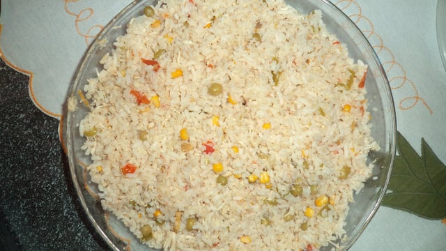 Quando o arroz estiver pronto, misture aos poucos em uma travessa juntamente com o peito de frango, o milho verde e a ervilha.