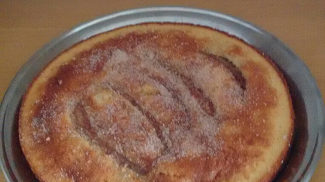 Retire do forno e com o bolo ainda quente, salpique açúcar e canela.