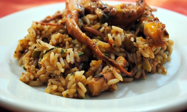 Cozinhe separadamente o arroz, polvo, a lula e o camarão.