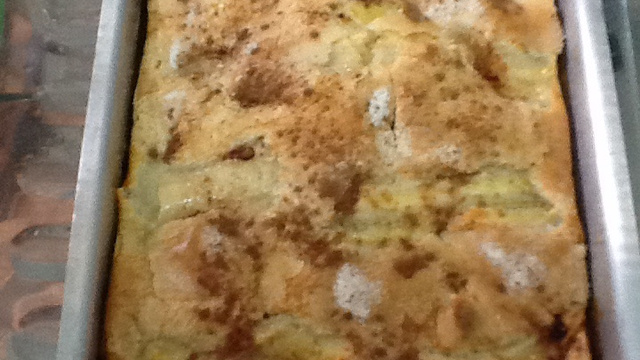 Coloque metade da massa em assadeira untada e enfarinhada, sobre essa metade de massa, coloque fatias de bananas cortadas no sentido do comprimento.