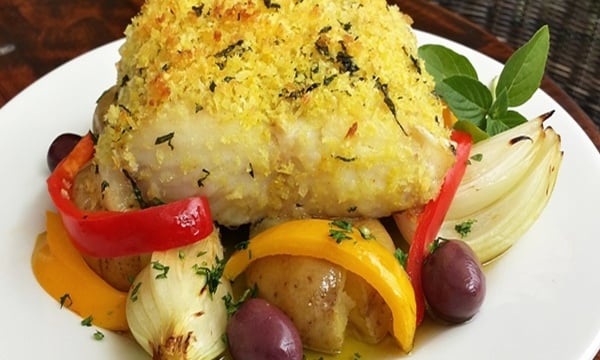 Está à procura de uma refeição fácil com bacalhau para impressionar em um dia especial? Então faça esse lombo de bacalhau à lagareiro! O peixe é muito utilizado na culinária portuguesa e essa parte do bacalhau tem a carne macia e fica ainda mais suculenta ao ser assada com os pimentões amarelos e vermelhos, as batatas, a cebola e os dentes de alho. Para completar, não pode faltar muito azeite regado como é típico desta receita. A farofa, que é feita com farelo de pão frito no azeite e alho picado, dá um toque de crocância que harmoniza perfeitamente com a comida. E a boa notícia é que você não precisa ficar horas na cozinha para preparar a receita de bacalhau à lagareiro. Ele é perfeito para servir em um jantar sofisticado sem se enrolar na elaboração de pratos complicados. Se essa refeição te deu água na boca só de pensar, então não perca tempo e faça já.