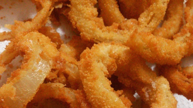 Frite, até ficarem douradinhos e passe os anéis para o papel toalha.
