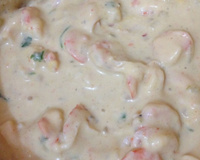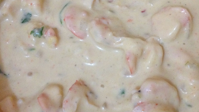 Corte, em cubinho, os queijos e misture ao camarão já refogado em fogo baixo.