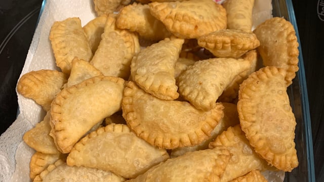 Transfira a massa (feita acima) para uma superfície lisa e enfarinhada. Com um rolo, abra a massa bem fina e corte discos (7 cm de diâmetro). Coloque uma porção de recheio sobre cada disco de massa, dobre ao meio em meia lua e feche apertando as bordas com um garfo. Frite os pastéis em óleo quente até dourar. Retire e escorra em papel absorvente. Sirva em seguida.