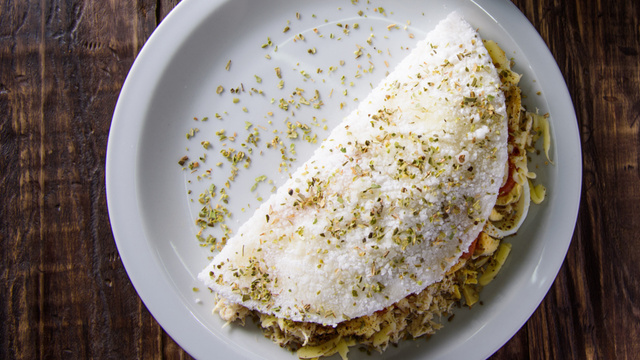 Passe o cream cheese na tapioca, coloque a mistura e faça um rolinho.