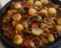 Por fim, coloque o molho de tomate, dissolva o caldo de carne em um copo de água quente, e regue sobre tudo.