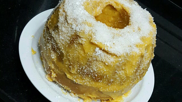 Adicione custard (creme pasteleiro) em pó, leite condensado e água.