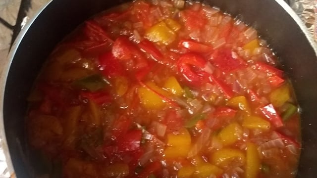 Adicione a cebola, o pimentão e o tomate já picados, adicione o sal e mexa bem.