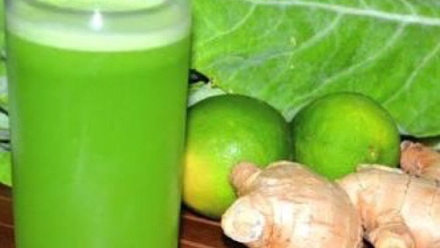 Lave bem as folhas de couve e bata no liquidificador com o suco das laranjas e os demais ingredientes.