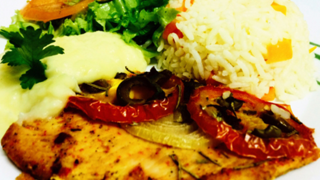 Disponha os filés de peixe, corte em rodelas os tomates, a cebola, o pimentão e coloque por cima dos filés de maneira harmoniosa.