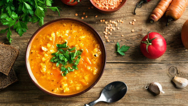 Adicione a lentilha, batata, cenoura, sal, o caldo de carne e acrescente água até que cubra todos os ingredientes.